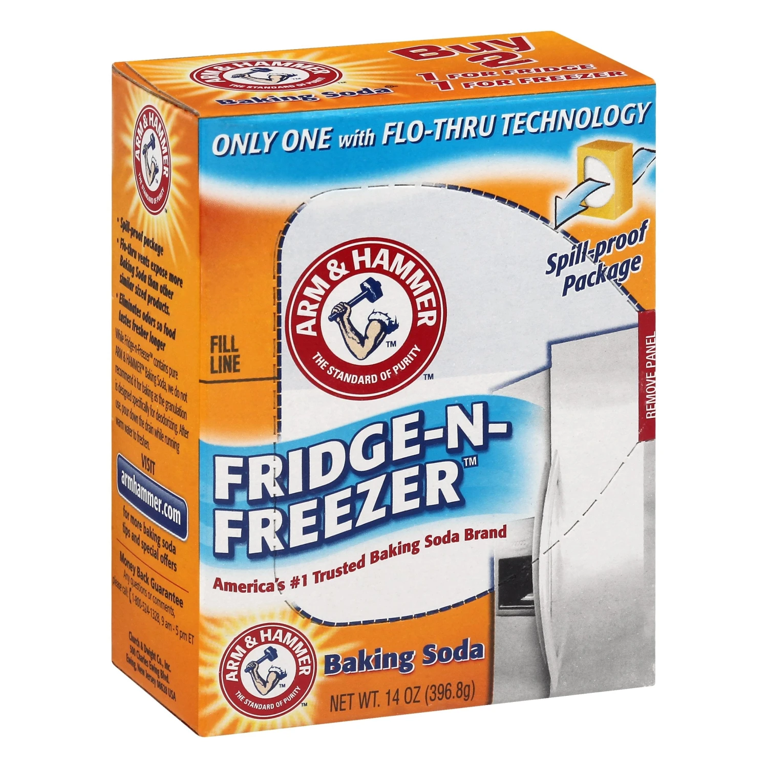 Only one with flo-thru technology. The standard of purity. America’s no. 1 trusted baking soda brand. Buy 2: 1 for fridge; 1 for freezer. Flo-thru vents expose more baking soda than other similar sized products. Eliminates odors so food tastes fresher longer. While fridge-n-freezer contains pure Arm & Hammer baking soda, we do not recommend it for baking as the granulation is designed specifically for deodorizing. After use, pour down the drain while running warm to freshen. Money back guarantee. Any questions or comments, please call: 1-800-524-1328, 9 am – 5 pm ET. armhammer.com. Visit armhammer.com for more baking soda tips and special offers. Spill-proof package.