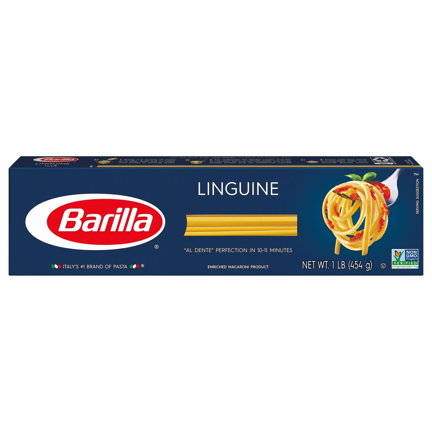 Enriched macaroni product. Non GMO Project Verified nongmoproject.org. Italy’s no. 1 brand of pasta. Al dente perfection in 10-11 minutes. Masters always strive for perfection Through passion, dedication, and innovation for 140 years, Barilla has been continuously striving to perfect Italy’s favorite pasta. Barilla Linguine n.13 is thicker for a better al dente mouthfeel. www.barilla.com. how2recycle.info. Find recipe inspiration at www.barilla.com. Call 1-800-922-7455 with any comments or questions. Made in the USA. With USA and imported ingredients.