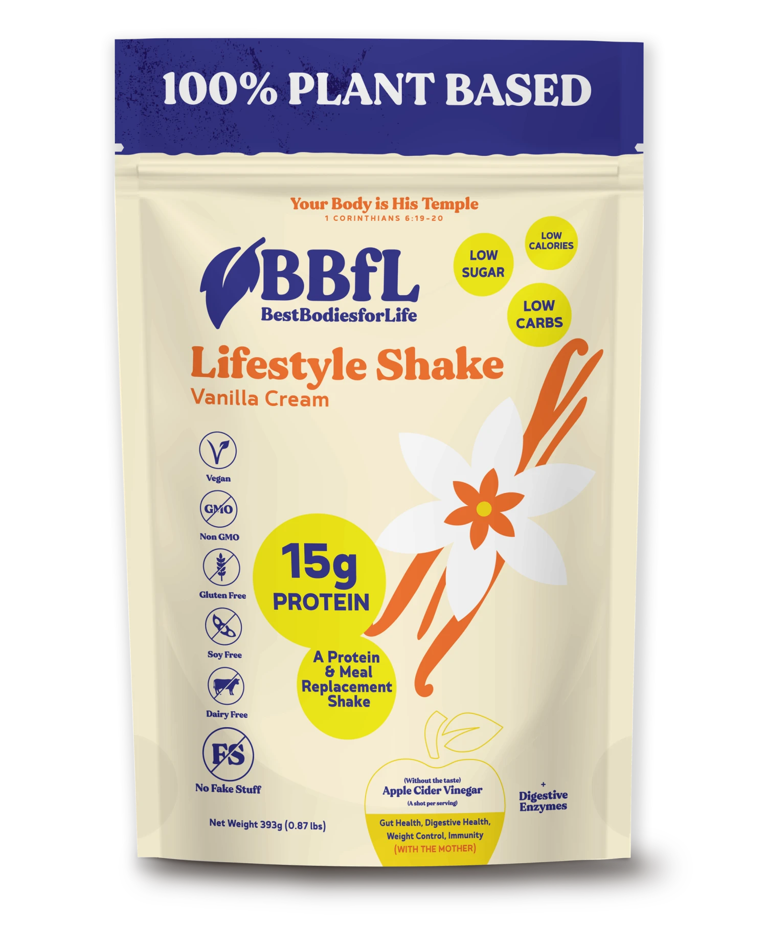 Our BBfL Plant Based Vanilla Cream consists of our 100% sourced plant protein blend for not just a creamy and delicious consistency, but also for a full and complete amino acid profile for muscle recovery, appetite management and good health. In addition to a great source of vegan friendly protein, we focus on providing you with excellent gut-health focused ingredients like Apple Cider Vinegar, Enzymes and more. Each ingredient is carefully sourced to not only provide you with an authentic Vanilla Bean experience, but the benefit and confidence that each ingredient offers. 15g Protein, 100% Plant Protein, Apple Cider Vinegar, Digestive Enzymes, All in One Shake for Women & Men.