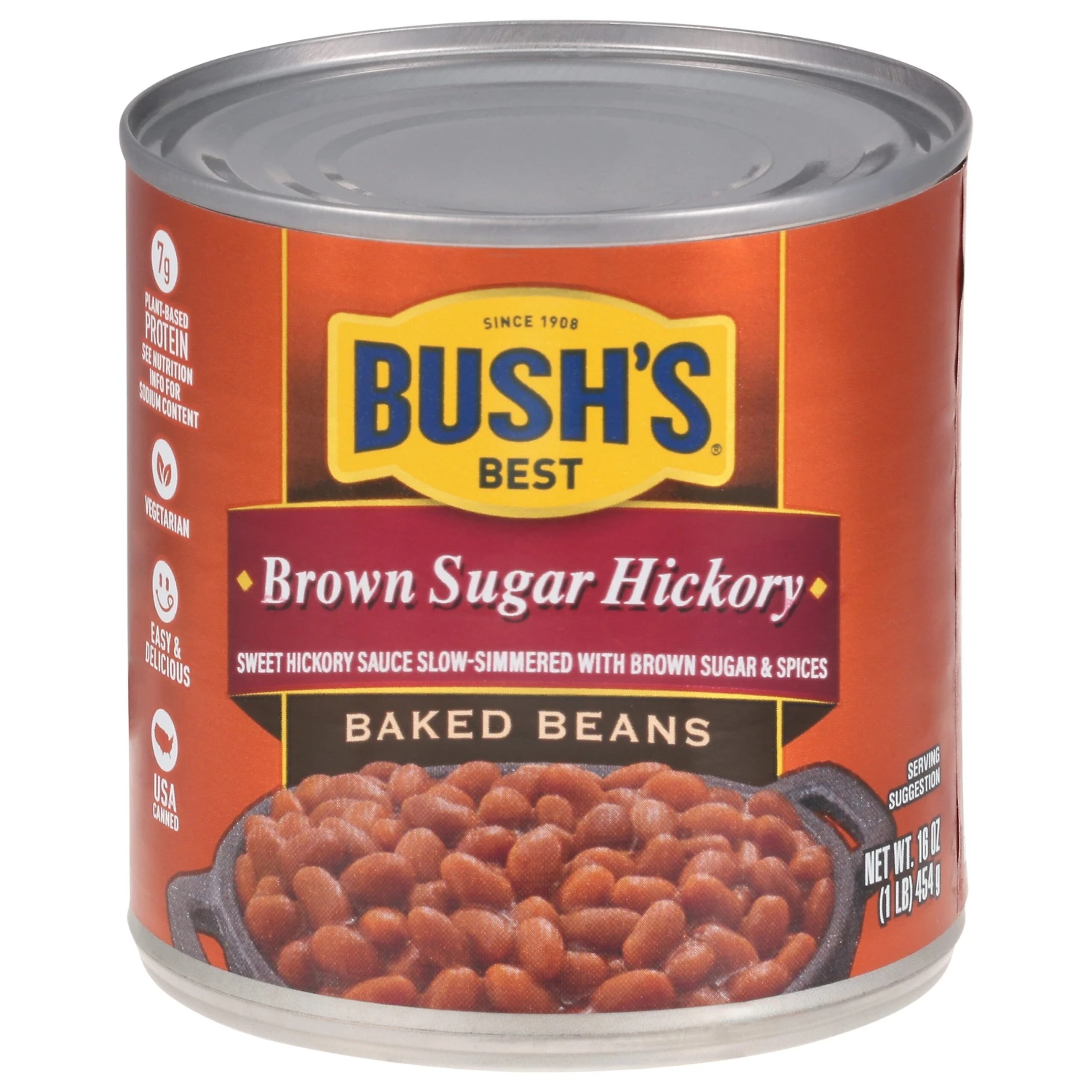 Sweet hickory sauce with brown sugar and spices. Gluten free. Good source of fiber. Vegetarian. See nutrition information for sodium content. Since 1908. Vegetarian recipe. Secret family recipe. Hotdogs love beans like savory loves sweet. Secret family recipe. www.bushbeans.com. Please recycle.