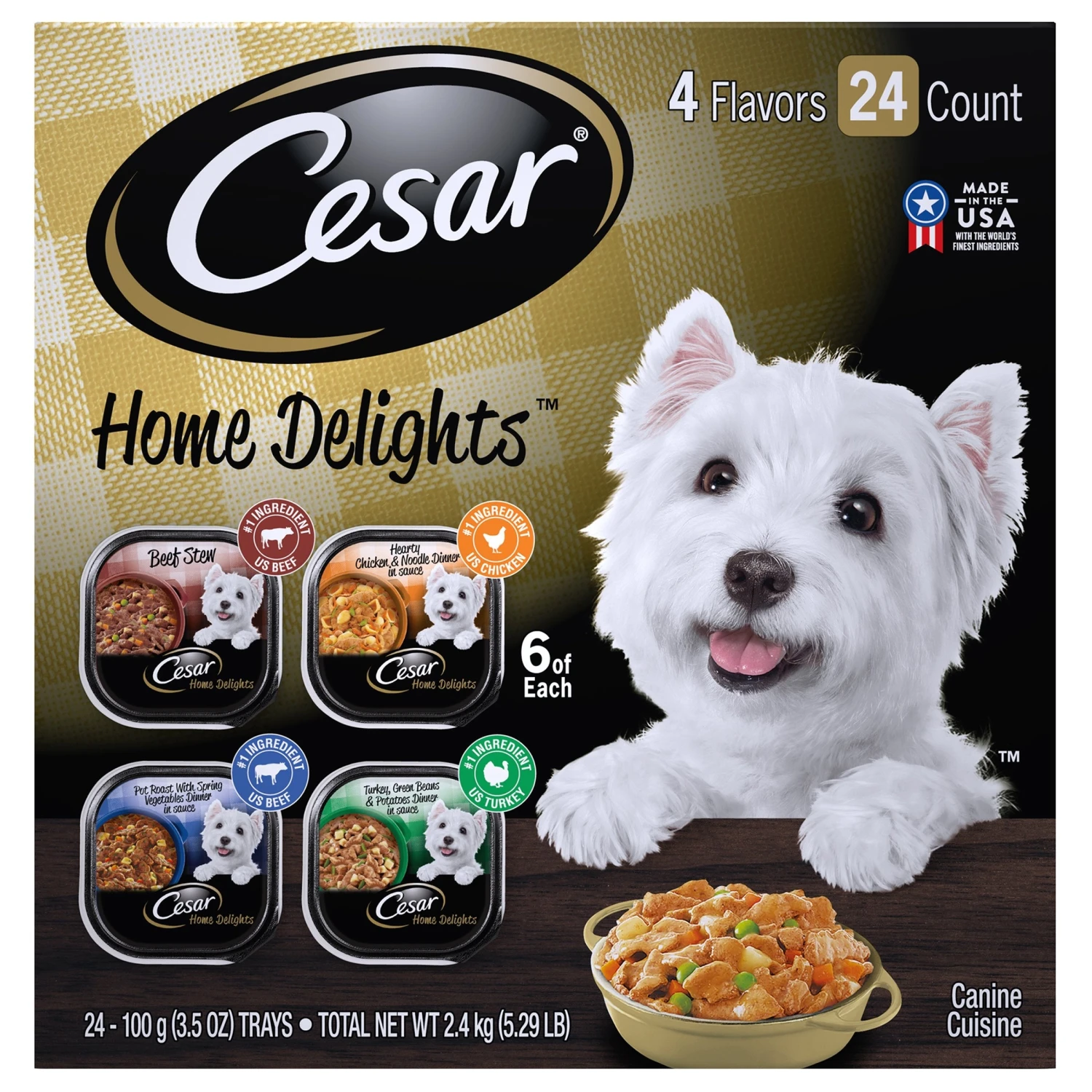 6 of Each: Beef stew. Hearty chicken & noodle dinner in sauce. Pot roast with spring vegetables dinner in sauce. Turkey, green beans & potatoes dinner in sauce. No. 1 ingredient US beef. No. 1 ingredient US chicken. No. 1 US turkey. Cesar Canine Cuisine is guaranteed to tempt even the fussiest eater. If not satisfied or to learn more call 1-800-525-5273 or visit cesar.com. cesar.com. To learn more call 1-800-525-5273 or visit cesar.com. Made in the USA with world’s finest ingredients. (Cesar Home Delights Beef Stew): Calorie Content (Calculated): 917 kcal ME/kg, 92 kcal ME/tray. Cesar Home Delights Beef Stew Canine Cuisine is formulated to meet the nutritional levels established by the AAFCO Dog Food Nutrient Profiles for maintenance. (Cesar Home Delights Pot Roast with Spring Vegetables Dinner in Sauce): Calorie Content (Calculated): 917 kcal ME/kg, 92 kcal ME/tray. Cesar Home Delights Pot Roast with Spring Vegetables Dinner in sauce Canine Cuisine is formulated to meet the nutritional levels established by the AAFCO Dog Food Nutrient Profiles for maintenance. (Cesar Home Delights Hearty Chicken & Noodle Dinner in Sauce): Calorie Content (Calculated): 978 kcal ME/kg, 98 kcal ME/tray. Cesar Home Delights Hearty Chicken & Noodle Dinner in sauce is formulated to meet the nutritional levels established by the AAFCO Dog Food Nutrient Profiles for maintenance. (Cesar Home Delights Turkey, Green Beans & Potatoes Dinner in Sauce): Calorie Content (Calculated): 961 kcal ME/kg, 96 kcal ME/tray. Cesar Home Delights Turkey, Green Beans & Potatoes Dinner in sauce is formulated to meet the nutritional levels established by the AAFCO Dog Food Nutrient Profiles for maintenance.