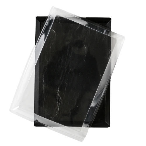 Need an attractive and cost-effective way to sell cheese plates? These plastic trays look like slate and are an elegant packaging solution. Use them to package cheese and charcuterie platters. Thin, lightweight, and a well-fitting clear plastic lid make your platters look great and easy for your customer to transport and serve. Includes 50 trays with lids. Trays and lids ship in separate boxes.