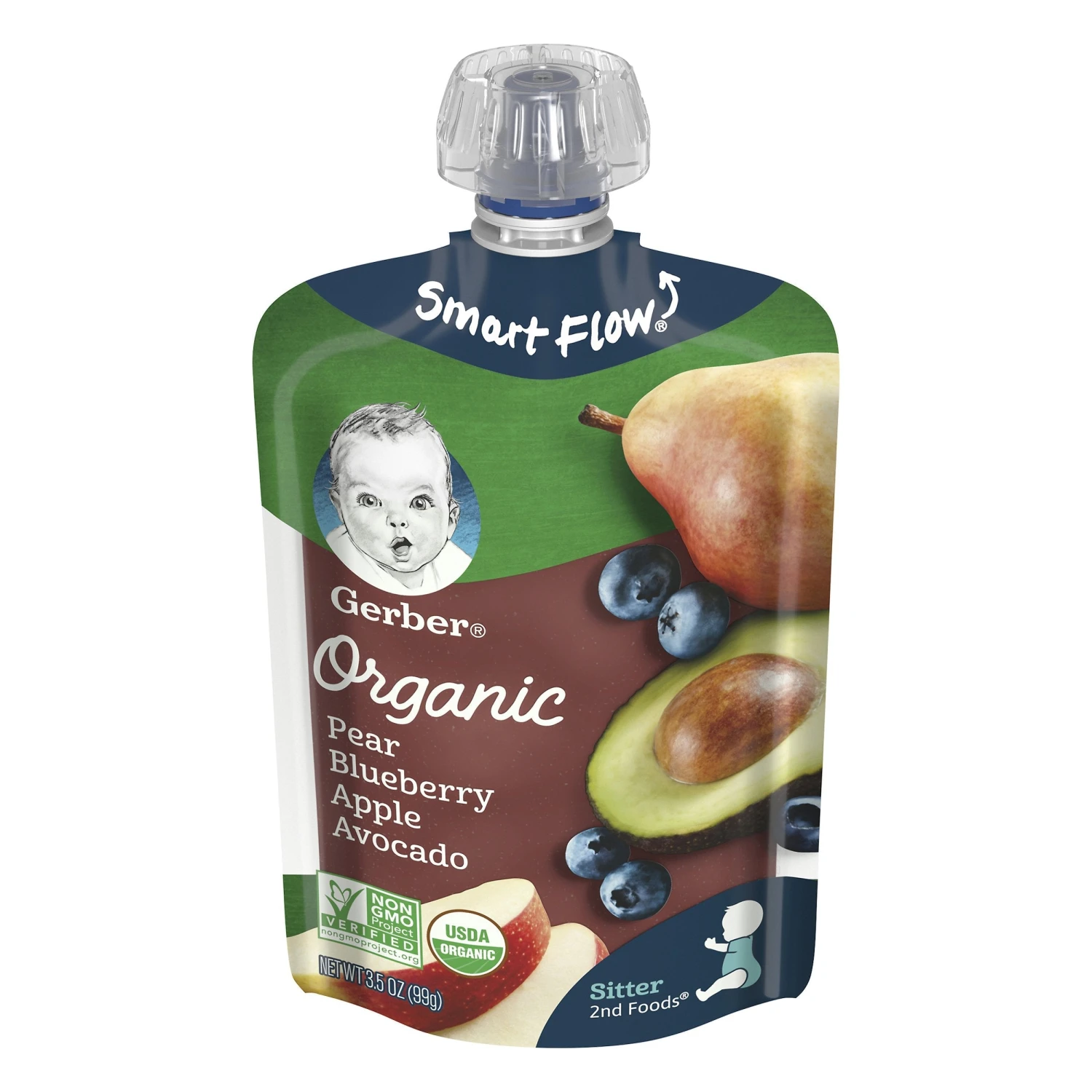 Sitter. No artificial flavors or colors. USDA Organic. Certified Organic by Oregon Tilth. Non GMO Project verified. nongmoproject.org. Smart Flow: Spout for less mess. Grown with clean field farming practices: 1/4 pear; 28 blueberries; 1/6 apple; 1/2 tbsp avocado in each pouch. Simply the good stuff. MyGerber.com. We’re awake when you are. Visit MyGerber.com & meet Dotti: 1-800-4-Gerber. Spanish: 1-800-511-6862 Package made with No BPA. Recycle through Terracycle.