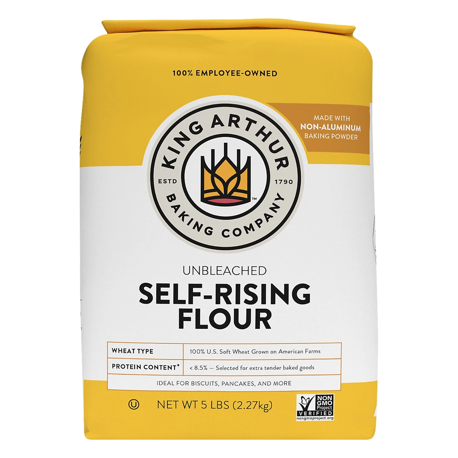 Non GMO Project verified. nongmoproject.org. Made with non-aluminum baking powder. Baking with joy since 1790. Wheat Type: 100% US soft wheat grown on American farms. Protein Content: 8.5% – selected for extra tender baked goods(Protein: The power in your flour) This bag makes 160 biscuits or pancakes. Raise your flour IQ. Protein is the ultimate attribute of quality in wheat flour. Choosing the right protein content for your recipe makes your bread rise higher, your cakes moist, and your pizza crust chewier. Protein content in other flour brands can by 2% or more from one bag to the next. Protein content 8.5%. Soft wheat selected for light protein content. Creamy taste, lighter-than-air texture. Tightest specifications in the industry for great results every time you bake. We say no to bleach. Most flour companies add benzoyl peroxide, chlorine dioxide, or azodicarbonamide to chemically whiten or artificially strengthen their flours. We want your baked goods to taste delicious and be something you feel good about feeding your family and friends. King Arthur Flour contains no bleach, no bromate, and no artificial preservatives of any kind. What you get in place of these chemical bleaching agents is superior grain and our 225+ year commitment to purity. Not a bad trade off, if you ask us. Say no to raw dough. Flour is a raw ingredient. Bake fully before enjoying. No compromises. No preservatives. Made with non aluminum baking powder. 100% Satisfaction Guaranteed. 100% Committed to Quality. Our Quality Promise: Flour this good doesn’t happen by accident. With expertise and experience from field to bag, we craft our flour with care and a commitment to help you bake your best. KingArthurFlour.com Facebook. Instagram. To learn more, including when to select which flour, visit: KingArthurFlour.com/FlourIQ. We’re here to help. Baker’s Hotline: Call or chat online with questions for our friendly, experienced bakers. 855.371.BAKE (2253) KingArthurFlour.com/contact. 100% Employee-Owned: We’re 100% employee-owned company, every one of us bakers at heart. Our mission is to inspire connections and community by spreading the joy of baking. As a founding B Corp, we are committed to using the power of business as a force for social and environmental good. We care as much about our people, our community and our planet as we do our flour. Certified B Corporation. Please recycle.