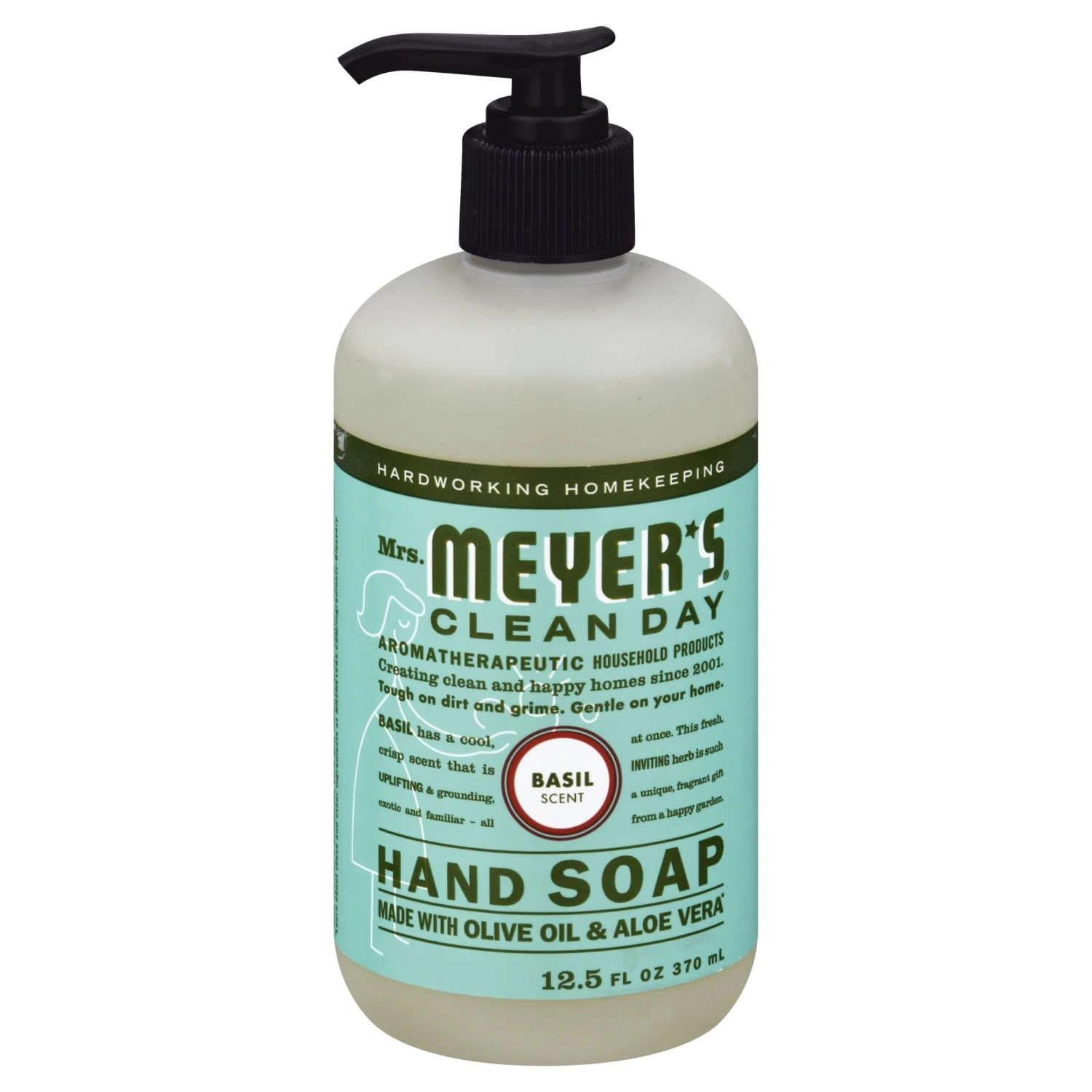 Made with Olive oil & Aloe vera (learn about these and other ingredients at Mrs.meyers.com/ingredients-glossary). Hardworking homekeeping. Aromatherapeutic household products creating clean and happy homes since 2001. Tough on dirt and grime. Gentle on your home. Basil has a cool, crisp scent that is uplifting & grounding, exotic and familiar – all at once. This fresh, inviting herb is such a unique, fragrant gift from a happy garden. We make effective, trusted formulas. Made with (Learn about these and other ingredients at Mrs.meyers.com/ingredients-glossary): plant-derived cleaning ingredients, essential oils, aloe vera extract, glycerin, olive oil. Made Without: Parabens & phthalates, MEA & DEA, Artificial colors. Mrs.meyers.com. how2recycle.info. Learn about these and other ingredients at Mrs.meyers.com/ingredients-glossary. Bottle (less pump) made with at least 30% post-consumer plastic. Contents are biodegradable.