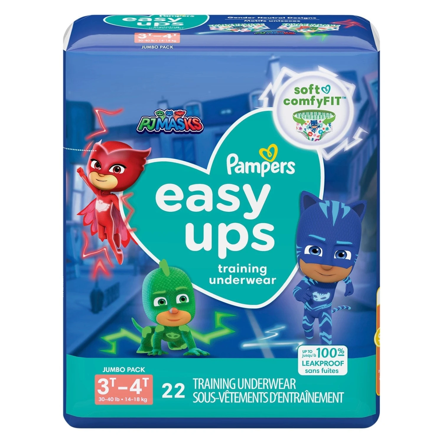 Soft comfyFit. Up to 100% leakproof. 30-40 lb (14-18 kg). Gender neutral designs. Hypoallergenic. Free of parabens. Free of latex (natural rubber). Entertainment one. As always, made with pampers light scent. how2recycle.info. Pampers.com. Download. Scan. Save. Pampers Club: Valid in the US, Canada and PR. For more information on common diapering questions such as choosing the right Pampers product for your baby, preventing diaper leaks, diaper rash, and potty training, please consult pampers.com or call 1-800-Pampers. Want to know more about the materials we use? Visit Pampers.com. Made in USA from domestic and imported materials.
