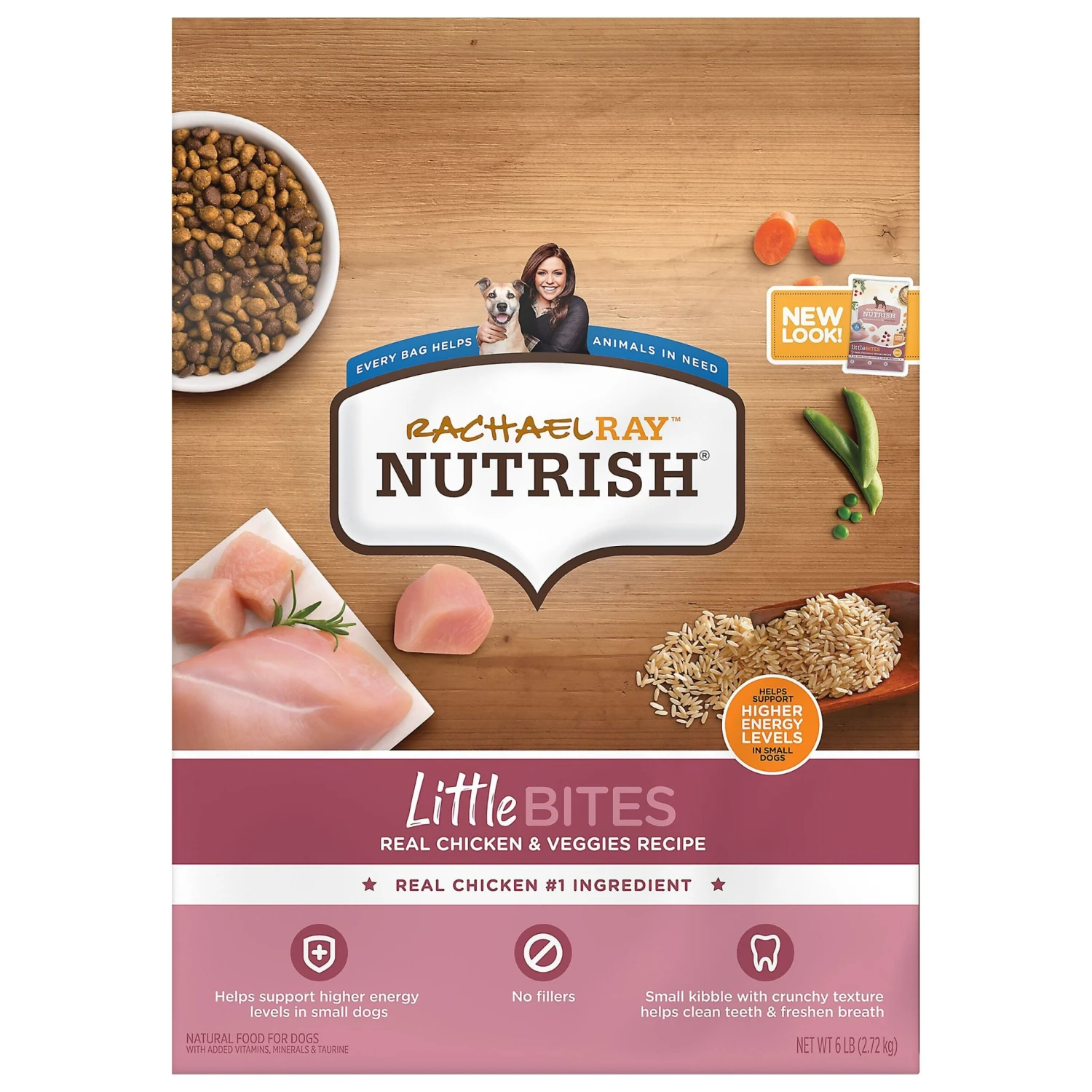 Natural food for dogs with added vitamins, minerals & taurine. No artificial flavors. No fillers. Every bag helps animals in need. New look! Helps support higher energy levels in small dogs. Real chicken no.1 ingredient. Small kibble with crunchy texture helps clean teeth & freshen breath. Ingredient Safety: We demand high-quality ingredients from our trusted suppliers and are committed to producing outstanding products every day. Our team take great pride in ensuring our foods are wholesome, delicious, and, most importantly, safe for your dog. Made with safe, high-quality ingredients. Rachael Ray Nutrish Little bites real chicken & veggies recipe is a dog food made with simple, natural ingredients plus added vitamins, minerals and taurine. It’s specially crafted with the unique needs of your small dog in mind. Real chicken is always the no.1 ingredient, which is combined with wholesome grains and veggies to create a perfect meal inspired by Rachael’s kitchen. With every bite, your little one will get the nutrition they need plus a taste they will love. Know what didn’t make it in our recipe? Poultry by-product meat, artificial flavors or artificial preservatives. Nothing but good, wholesome food here! Real chicken is always the no.1 ingredient which helps support healthy organs and maintain lean muscle mass. It is also a great source of protein. Peas & carrots are sources of fiber which help support healthy digestion. Brown rice is a healthy digestible carbohydrate, which is low in fat but high in fiber. It helps support healthy digestion while also providing your dog with a source of energy. Chicken fat is a naturally rich source of Omega – 6 and Omega -3 fatty acids, which help support healthy skin & coat. Actual size! Kibble size is important, especially for little mouths. Small kibble with a crunchy texture is perfect for little dogs to help clean teeth and freshen breath. Only the best, high-quality ingredients are selected and placed in every Rachael Ray Nutrish meal. Specially crafted formulas are backed by 80+ years of focused excellence in pet nutrition. Our trusted ingredient suppliers go through rigorous qualification. Real recipes. Real ingredients. Real good. 100% Complete & balanced nutrition for dogs. Quality Guarantee: We are committed to making great-tasting, nutritious food for your dog. If you or your pet are not completely satisfied with this product, we will provide a full refund. Call 1-800-323-7738 weekdays to talk to a customer care representative. nutrish.com. For questions or comments, please call 1-800-323-7738 weekdays or visit us online at nutrish.com. Learn more: nutrish.com/ingredients. Rachael Ray Foundation: Helps animals in need, and a portion of the proceeds from the sale of this product will be donated to the The Rachael Ray Foundation. The funds are used for care, medical supplies, treatments and more. So many animals need our help, and together, through The Rachael Ray Foundation, we can make a real differ. Every Nutrish purchase you make helps us continue helping dogs in need. Safely USA cooked with the world’s finest ingredients. Calorie Content (Calculated): Metabolize Energy (ME) 3690 kcal/kg; 390 kcal/cup. Rachel Ray Nutrish Little Bites Real Chicken & Veggies Recipe Dog Food is formulated to meet The nutritional levels established by the AAFCO Dog Food Nutrient Profiles for All Life Stages, including growth of large size dogs (70 lbs. or more as an adult).