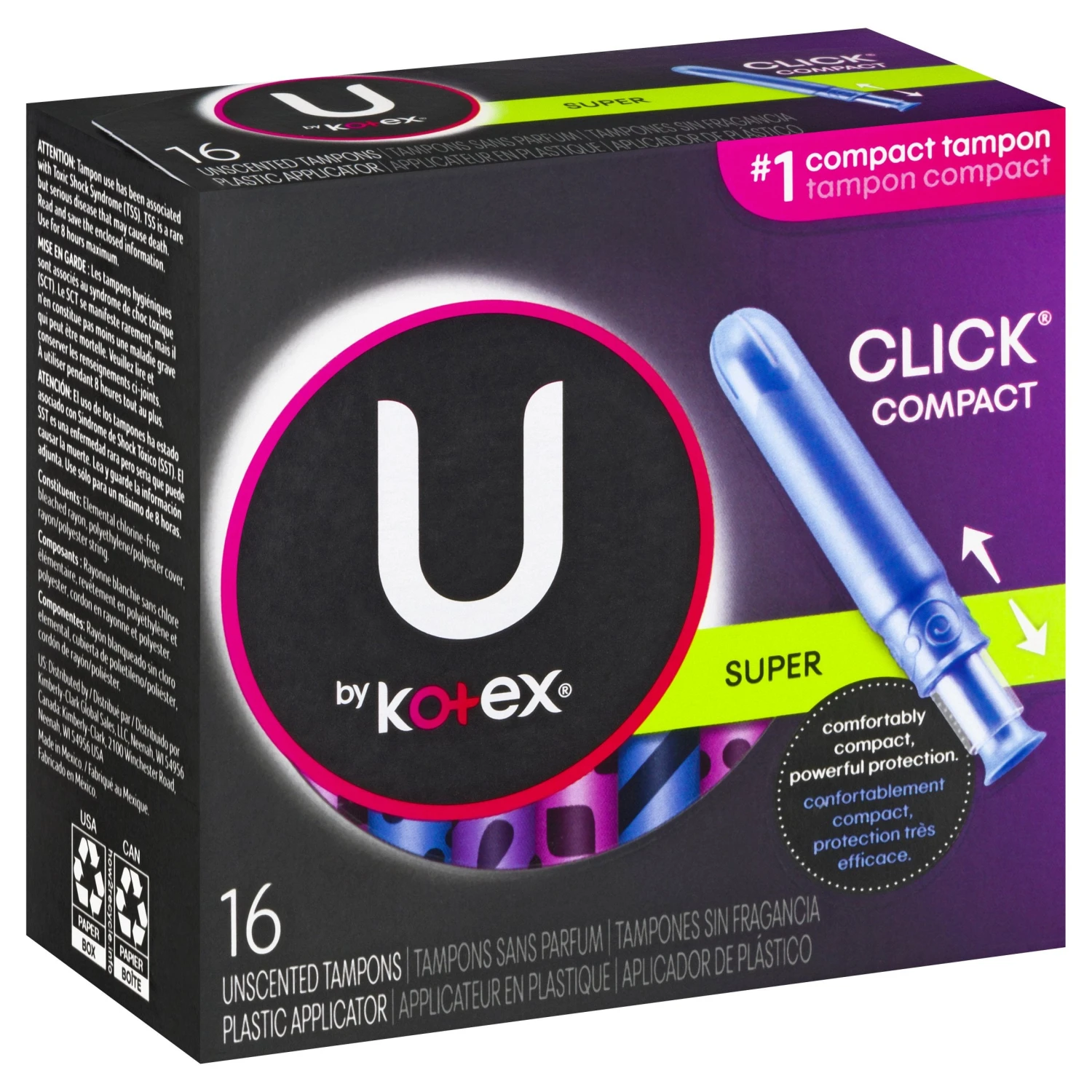 No. 1 compact tampon. Comfortably compact, powerful protection. Designed to keep up with you: comfortably compact; powerful protection; slim, smooth design. Pull until locks into place. These absorbency ranges and their corresponding terms are required to be used by all tampon manufacturers to indicate the amount of fluid absorbed using a standard laboratory test. Use the standardized absorbency ranges and terms to make comparisons between tampons of all manufacturers. 6-9 g. Super: 9-12 g. Super Plus: 12-15 g. Choose the minimum absorbency necessary to control your menstrual flow in order to reduce the risk of contracting TSS. UbyKotex.com. how2recycle.info. 1-800-335-6839 UbyKotex.com. Consumer Services, Kimberly-Clark Corp., Dept. KTUCS-16 PO Box 2020, Neenah, WI 54957-2020 USA. Proud US Partners: Alliance for period supplies with U by Kotex she can. Food or period products? Millions of women make choices like this due to lack of income. Get involved at: UbyKotex.com. Dispose in a trash receptacle. Dispose of properly. Made in Mexico.